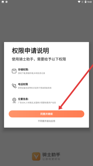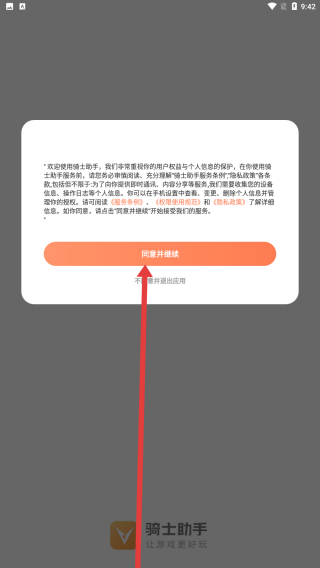 1、打開(kāi)騎士助手時(shí),會(huì)彈出隱私政策說(shuō)明彈窗,點(diǎn)擊同意并繼續(xù)按鈕,接受相關(guān)條款,進(jìn)入下一步權(quán)限申請(qǐng)界面。