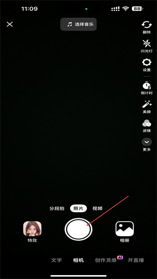 2、在拍攝頁(yè)面選擇音樂(lè)后,再點(diǎn)擊底部拍攝按鈕,開始錄制視頻。