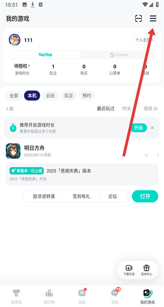 1、在TapTap“我的游戲”頁面點擊右上角三條橫線菜單按鈕。