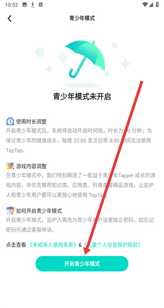 4、在青少年模式頁面點擊“開啟青少年模式”,進(jìn)行開啟。