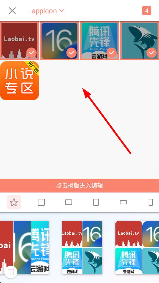 3、進(jìn)入照片選擇界面后,勾選想要拼圖的照片,選好后點(diǎn)擊下方點(diǎn)擊模版進(jìn)入編輯區(qū)域。