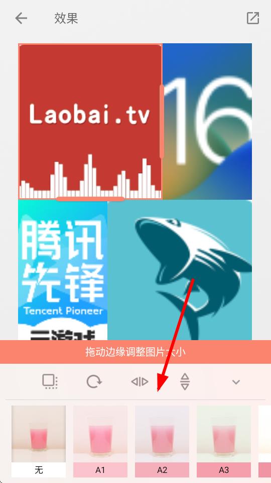 4、進(jìn)入編輯界面,通過(guò)拖動(dòng)邊緣調(diào)整圖片大小,還能點(diǎn)擊下方類似濾鏡效果的選項(xiàng),為拼圖添加不同效果,完成后保存,即可實(shí)現(xiàn)自由拼圖。