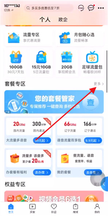 1、首先,打開(kāi)軟件進(jìn)入,并從首頁(yè)向下滑動(dòng),找到【套餐專區(qū)】;