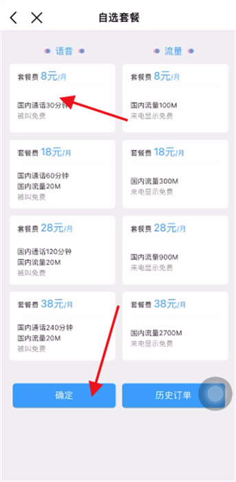 5、最后,能夠看到這里有很多套餐,如8元、38元等等,選擇之后點(diǎn)擊【確定】即可直接辦理。