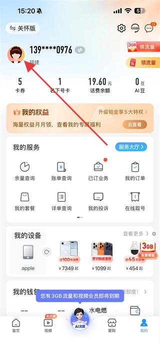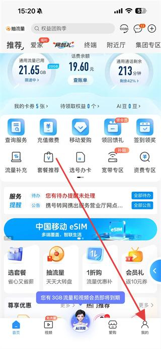1、打開(kāi)中國(guó)移動(dòng)APP,點(diǎn)擊右下角我的,進(jìn)入個(gè)人頁(yè)面。