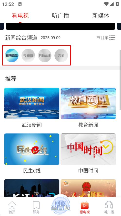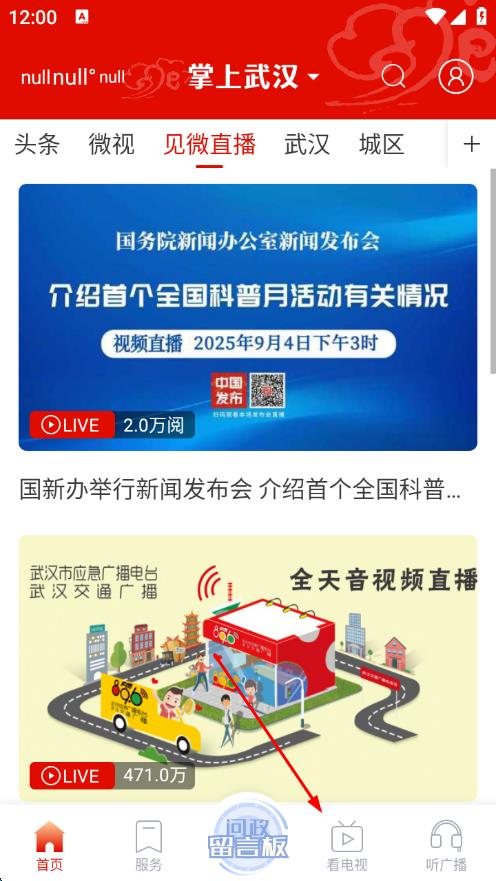 1、打開掌上武漢App,點(diǎn)擊底部導(dǎo)航欄中的看電視圖標(biāo)。