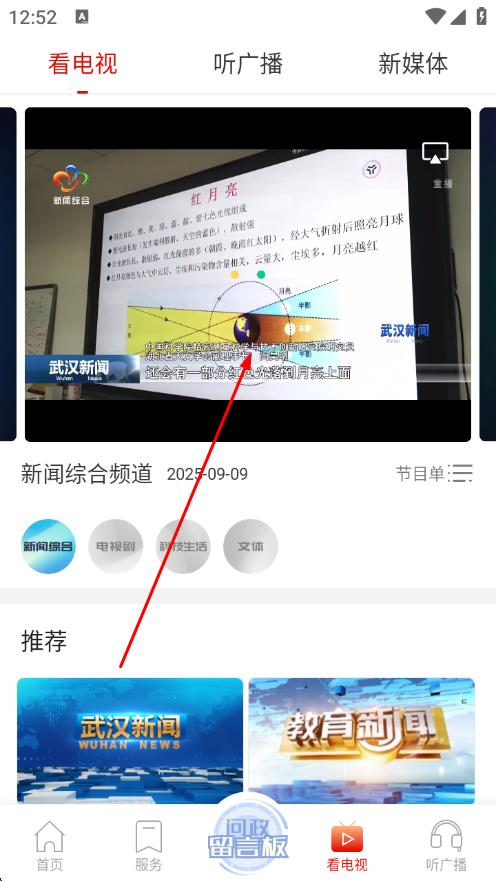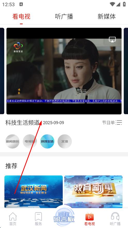 2、進(jìn)入看電視界面后,頁面上方會顯示正在直播的節(jié)目畫面。