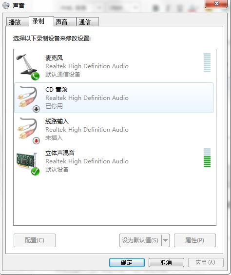 首先,通過打開控制面板->聲音->選擇“錄制”選項卡(或者直接在桌面右下角任務(wù)欄的小喇叭上右鍵->選擇“錄制設(shè)備”),就可以看到下面的界面: