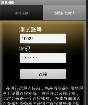 然后在手機上百變遙控 連接界面,選擇遠程控制選項,填入測試賬號和連接密碼