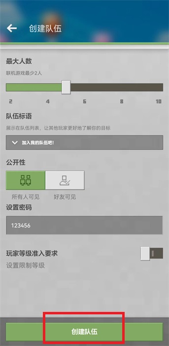 4、在這個(gè)創(chuàng)建隊(duì)伍的界面中,可以選擇創(chuàng)建的人數(shù)、公開(kāi)性還有密碼,有了密碼別人就不會(huì)加入了,點(diǎn)擊下方的【創(chuàng)建隊(duì)伍】進(jìn)入到房間中;