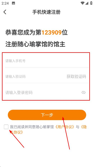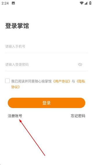 1、打開隨心瑜掌館APP,在登錄頁面點(diǎn)擊注冊賬號。