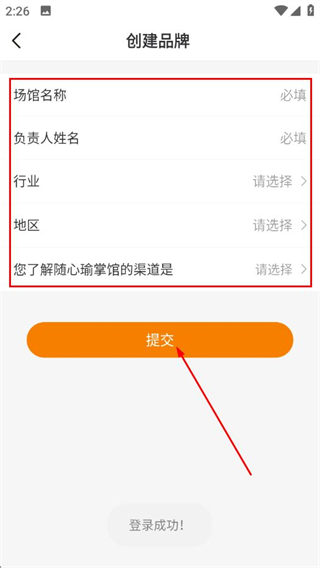 3、填寫場館名稱、負(fù)責(zé)人姓名、選擇行業(yè)、地區(qū)及了解渠道后,點(diǎn)擊提交完成注冊。