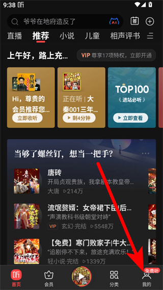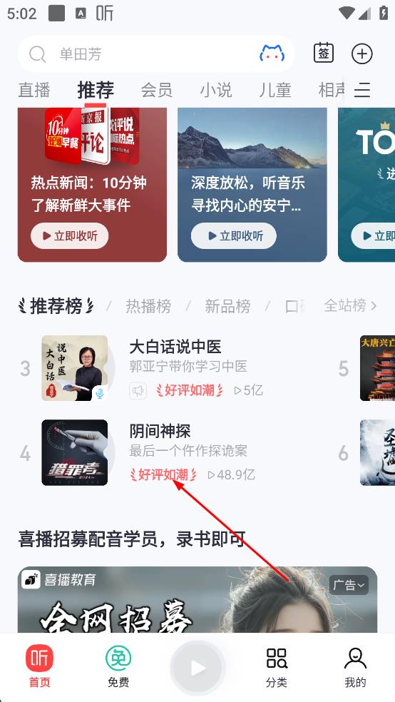 3、在APP主界面,瀏覽推薦的各類內(nèi)容,找到感興趣的音頻作品,比如“陰間神探”,點(diǎn)擊進(jìn)入該作品的詳情頁面。