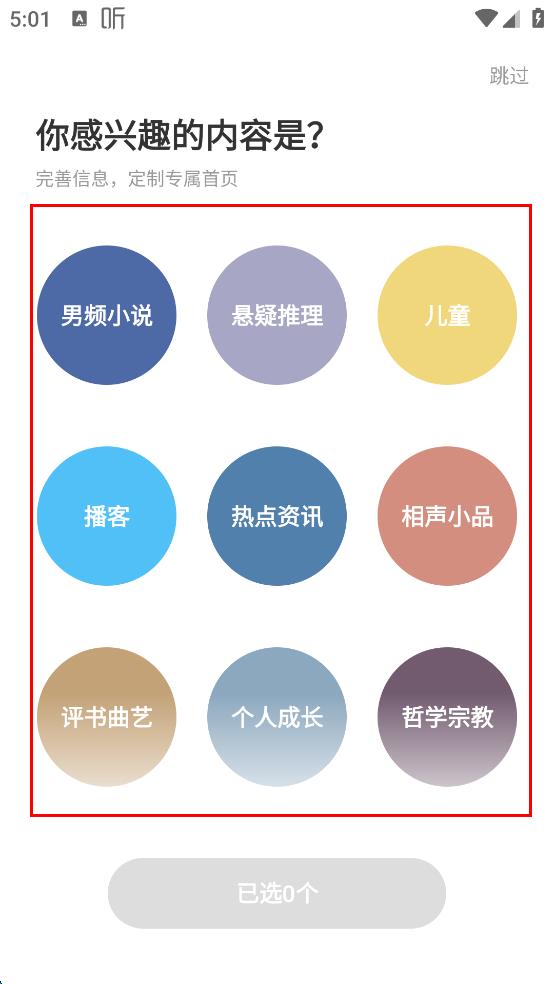 2、在興趣選擇頁面,有“男頻小說”“懸疑推理”等多種內(nèi)容分類選項(xiàng),可根據(jù)自身興趣選擇相應(yīng)分類,完成后進(jìn)入APP主界面。