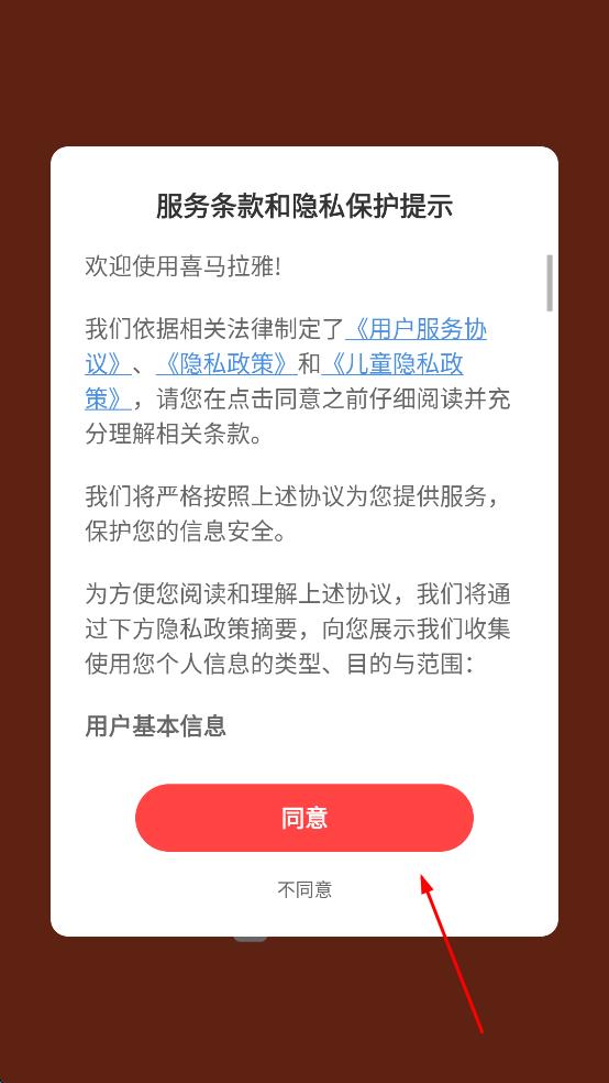 1、打開喜馬拉雅APP,彈出服務(wù)條款和隱私保護(hù)提示框,仔細(xì)閱讀相關(guān)內(nèi)容后,點(diǎn)擊“同意”按鈕,進(jìn)入APP內(nèi)的興趣選擇頁面。