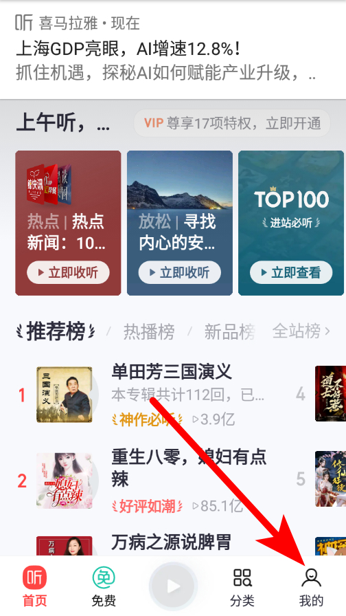 1、在喜馬拉雅首頁,點(diǎn)擊右下角我的選項(xiàng),進(jìn)入個人中心界面。