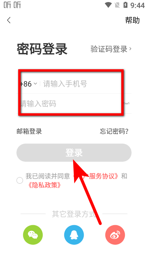 4、輸入手機(jī)號和密碼,勾選同意點(diǎn)擊登錄按鈕,即可完成密碼登錄操作。