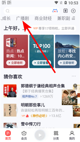 1、在喜馬拉雅首頁,點(diǎn)擊廣播劇選項(xiàng),進(jìn)入廣播劇分類頁面。