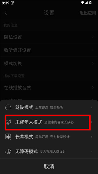 4、在模式選擇菜單中,點(diǎn)擊未成年人模式選項(xiàng),即可開啟青少年模式。