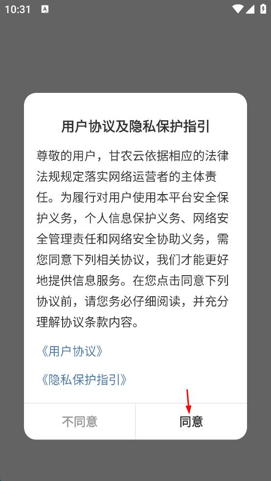 1、打開甘農(nóng)云APP,在彈出的用戶協(xié)議及隱私保護(hù)指引頁面,點(diǎn)擊“同意”按鈕,進(jìn)入APP主界面。