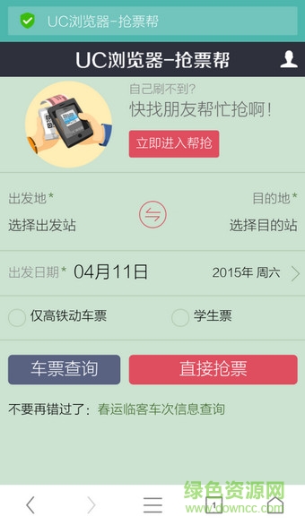 第一步:打開uc瀏覽器,從手機酷站里點“搶車票”,進入uc搶票專家,需要事先準備好鐵道部12306網(wǎng)站的賬戶密碼,然后登錄。