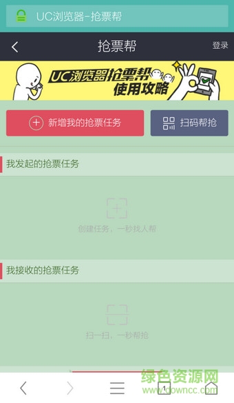 第二步:遇到想買的火車票無票的情況時,除了可以自己進行云端刷票外,還可以通過“搶票幫”創(chuàng)建一個搶票任務(wù)。在uc搶票專家的頁面頂端進入“搶票幫”幫搶頁面,點擊“新增我的搶票任務(wù)”按鈕后將乘車區(qū)間、乘車日期、車次類型、車次、席別、乘車人等搶票所需的所有信息都輸入這個任務(wù),生成搶票任務(wù)。