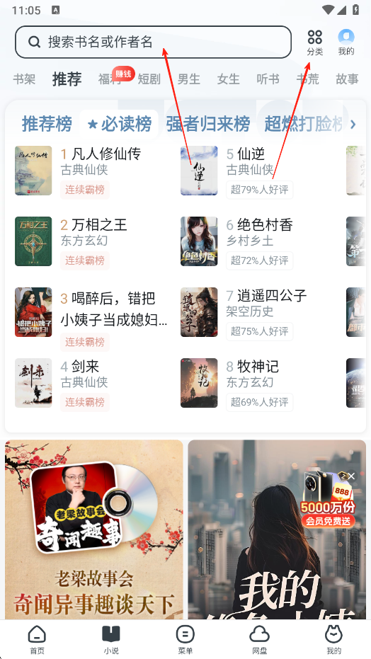 2、點擊底部小說選項,進入小說頁面,在頂部搜索框可輸入書名或作者名查找小說,也能點擊分類,根據(jù)不同分類瀏覽小說,還能查看推薦榜等榜單上的熱門小說。