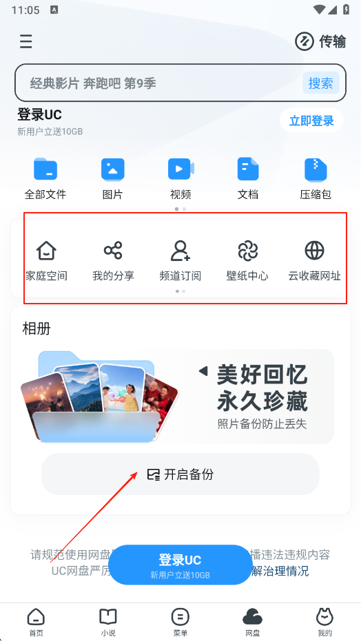 3、進入網(wǎng)盤頁面,可使用搜索功能查找文件,也能通過全部文件,圖片等分類查看對應(yīng)文件,還能點擊開啟備份,對相冊等內(nèi)容進行備份,同時也可使用家庭空間,我的分享等功能。