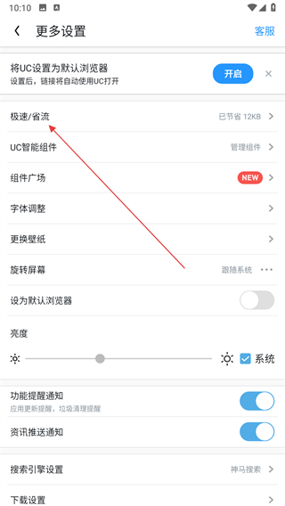 3、在設(shè)置頁面找到極速/省流選項,點擊進入極速/省流設(shè)置頁面。
