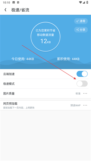 4、在極速/省流設(shè)置頁面找到極速模式選項,點擊其右側(cè)的開關(guān)按鈕。