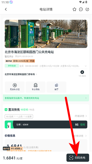 4、在電站詳情頁面,可查看電站的位置、設施、價格等信息,還可進行掃碼充電操作。