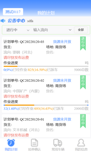貨源信息發(fā)布板塊為物流車(chē)隊(duì)提供貨源大廳平臺(tái),物流車(chē)隊(duì)可以將提貨計(jì)劃標(biāo)注運(yùn)費(fèi)后發(fā)布為貨源,展示給系統(tǒng)內(nèi)所有司機(jī)用戶(hù),供司機(jī)用戶(hù)自主選擇貨物。
