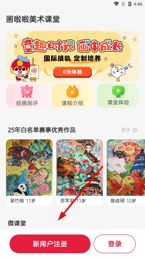 1、打開畫啦啦美術(shù)課堂app在首頁中找到并點擊新用戶注冊按鈕,進入注冊登錄界面。