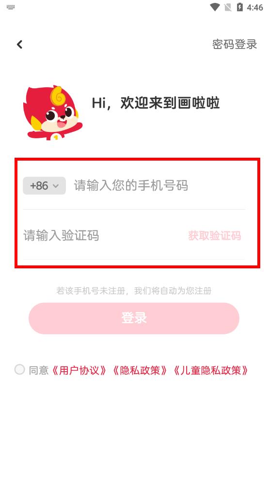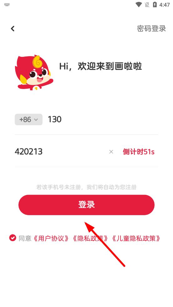 3、勾選下方的同意用戶協(xié)議選項,然后點擊登錄按鈕,若該手機號未注冊,系統(tǒng)將自動為您完成注冊。