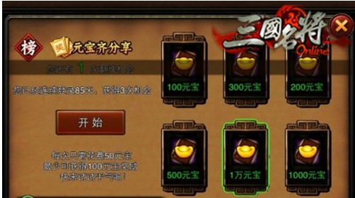 免費游戲,其實大家都明白什么是免費游戲,完全免費是不可能的。不過天拓游戲《三國名將》確實是一款非常適合非R玩家玩的手游,因為在游戲里有很多方法可以拿到免費的元寶!下面小編就給大家介紹一個最簡單最無腦的方法。那就是每天登入?yún)⒓印霸獙毞窒砘顒印?,新人只要每天登入簽到就可以獲得一次免費的翻牌抽獎機會(注:隨著玩家登入次數(shù)的增多,玩家獲得的抽獎機會也是隨之增多),而這個活動里的六張牌是百分百能中元寶的,最少都有100。所有大家千萬不要錯過,那怕沒時間玩,也可以登入下領取元寶。