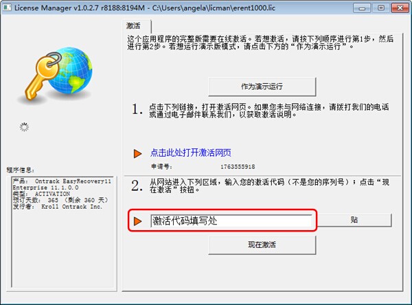 再次打開easyrecovery軟件,在激活界面“激活代碼填寫框”內(nèi)輸入所獲取的激活代碼(注意:不是您的序列號哦),點擊“現(xiàn)在激活”按鈕。