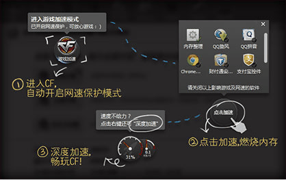 qq電腦管家cf定制版是qq電腦管家的第一個(gè)游戲?qū)0?,是QQ電腦管家為穿越火線玩家定制的專(zhuān)版客戶端。在電腦管家的基礎(chǔ)上,增加了CF加速和燃燒內(nèi)存等功能,還可以享受專(zhuān)屬皮膚功能,CF玩家不可不用。