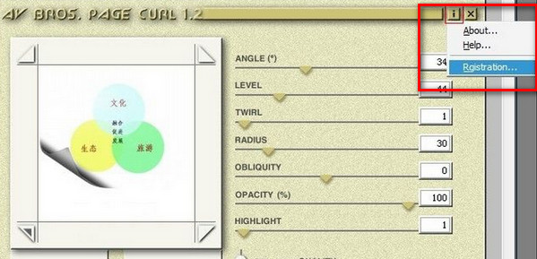 安裝完畢后,運(yùn)行Photoshop,打開一幅圖像,然后你會(huì)在頂部菜單Fliter的下拉菜單中發(fā)現(xiàn)一個(gè)叫AV Bros的選項(xiàng),在AV Bros中選擇page curl選項(xiàng),我們就進(jìn)入到page curl的工作界面了(圖1)。