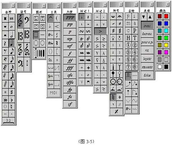 工具條共有11條,包括音符、譜號、圖形、工具、力度、標(biāo)記1、標(biāo)記2、符號、吉他、表情、顏色等繪譜所需要的工具。他們可以在工作過程中根據(jù)需要打開、關(guān)閉和移動。如果這個工具條看不見了,可在“窗口菜單”的“工具條”中點擊“音符” 工具條(或其他工具條),重新打開他。