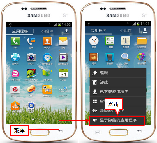 2.點(diǎn)擊【菜單】鍵,然后選擇【顯示隱藏的應(yīng)用程序】。
