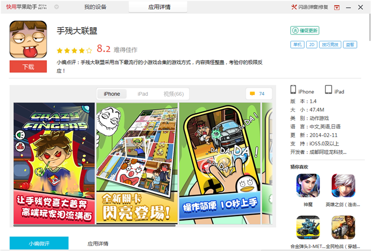 快用蘋果助手2014PC端2.3版本正式發(fā)布。與之前的版本相比,2.3版本在界面設計上更加簡單,去掉隱藏屬性,使界面一目了然,細節(jié)上的優(yōu)化,新增“7959玩游戲”欄目內容精彩,獨家推出了“iPhone6特權專享區(qū)”,是不是很心動呢,那就快來體驗吧。