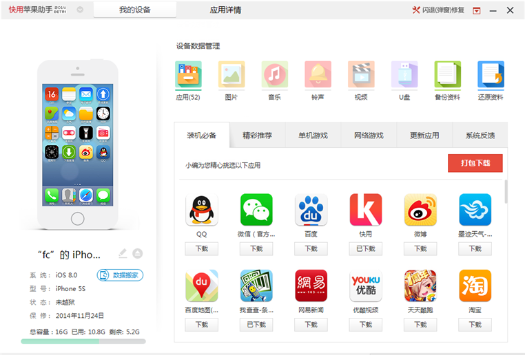 快用2.3界面欄目清晰,展示位豐富,內容緊湊且一目了然。在快用PC端2.3新版,我們充分考慮了用戶查看熱門應用/游戲的需求,在“特色新品”欄目特別新增了“熱門推薦欄”,讓用戶能在第一時間查看到我們推薦的新品熱門應用/游戲。對于新機,我們?yōu)榱朔奖阌脩舸虬螺d,批量操作,小快在“裝機必備”欄目新增了“打包下載”的功能,現(xiàn)在你只需輕松一點,所有功能即刻盡收囊中。