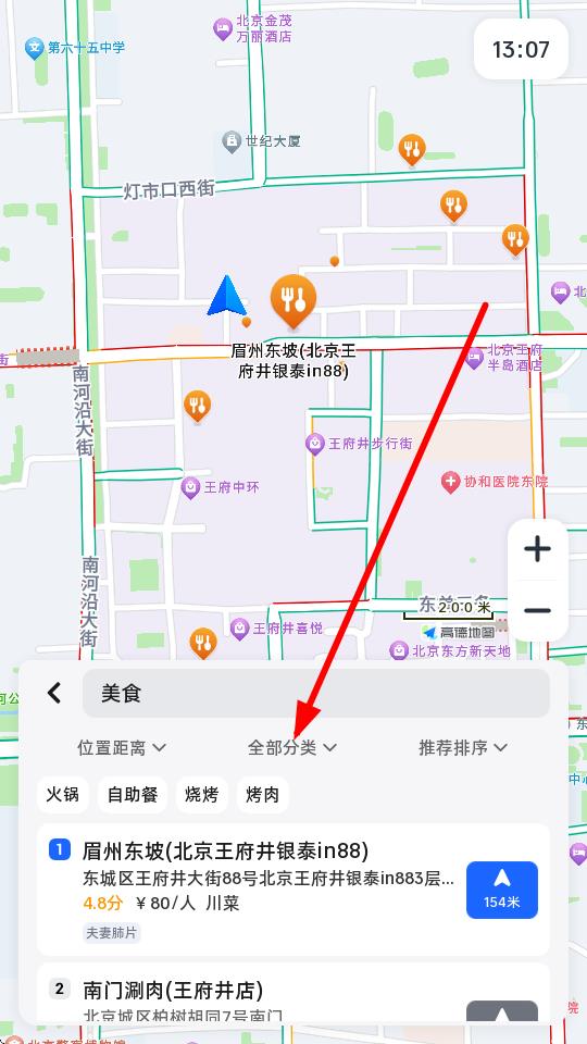 2、頁(yè)面跳轉(zhuǎn)后,會(huì)顯示附近美食店列表。點(diǎn)擊全部分類。