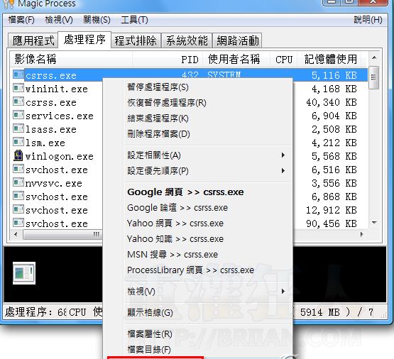 Magic Process這東西是個相當不錯的工具,只不過要能看得懂上面的資訊還是得有一些背景知識,像我這樣不是很懂的人,其實也不是那麼容易就可以看得出哪些程式有什麼樣的問題,頂多只是找出哪些可能是不應該出現(xiàn)的,或者名字很怪的軟體在偷偷運作而已。如果是簡單的小病毒或惡意程式在作怪,應該還是可以找得出來。