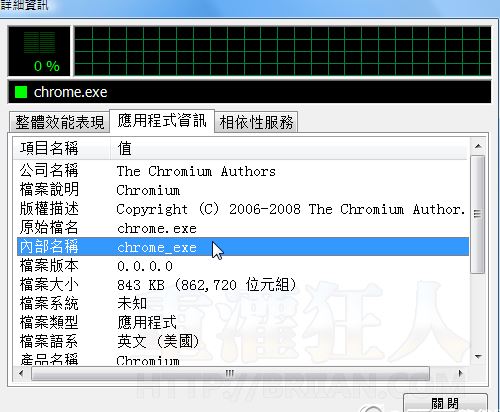 第4步、如圖,畫面中會依照「整體效能表現(xiàn)」、「應用程式資訊」與「相依性服務」來顯示這個處理程序的各種細節(jié)。