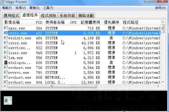 第1步、這軟體不用安裝,直接下載回來、解壓縮后按兩下「MagicProcess.exe」程式即可運作。打開之后,會有幾個分頁顯示目前電腦運作中的應用程式、處理程序…等等資訊。