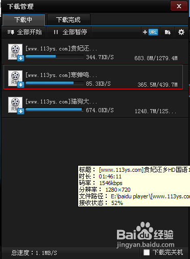 這時候百度影音才識別您復(fù)制到下載文件夾中的那個文件,接著未下載完成的繼續(xù)下載。