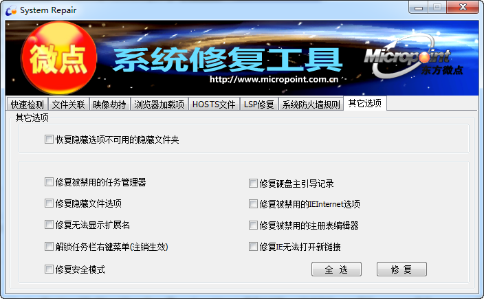 微點系統(tǒng)修復(fù)工具是一款綠色免費的系統(tǒng)修復(fù)軟件,該軟件功能強(qiáng)大,簡單易用,占用內(nèi)存小,能修復(fù)一些系統(tǒng)常見問題,包括文件關(guān)聯(lián)、修改host文件、修復(fù)ie不能打開等問題,喜歡的用戶就下載吧。