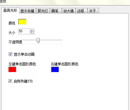 高亮鼠標(biāo)指針:用彩色圓圈高亮顯示鼠標(biāo)指針,當(dāng)你單擊鼠標(biāo)按鈕時圓形動畫可以顯示你鼠標(biāo)單擊的行為。