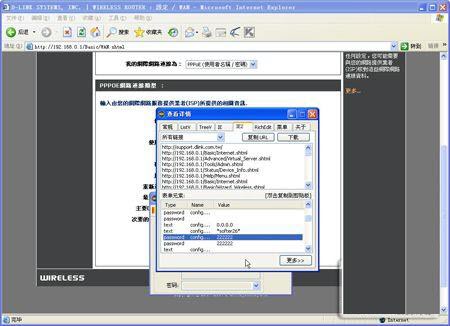 如果頁面針對星號進(jìn)行了加密的話,我們需要點該軟件的擴(kuò)展高級功能按鈕,然后切換到IE或IE2標(biāo)簽,軟件會進(jìn)一步分析頁面,然后我們在下面的表單元素中就可以看到星號對應(yīng)的明文信息了,筆者就通過這個軟件成功的還原恢復(fù)出了D-LINK路由器中保存的撥號帳戶以及對應(yīng)的星號密碼明文信息。這個小工具筆者也以附件的形式為各位讀者送上。